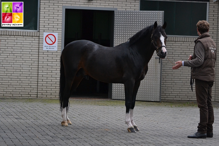 Consacrée aux 15 meilleurs sujets à l’issue des épreuves qualificatives, la finale des poneys de 6 ans a été mise à l’actif de Miss Mc Fly D (Mc Fly High D x Leuns Veld’s Lord), née chez Christa Dahlkamp et présentée par Lara Tönnissen. Cette jolie noiraude a tout bonnement obtenu des notes exceptionnelles : 8,8 et 9 ! Peter Teeuwen a expliqué que cette ponette énergique « était une vraie belle publicité pour le poney de sport allemand. Elle est intelligente et sait gérer chaque situation ! ». Jument à suivre donc… A noter que son père Mc Fly High D est un fils du grand champion de Concours Complet Mr Hale Bob (par Magnum), plusieurs fois médaillé aux championnats d’Europe.