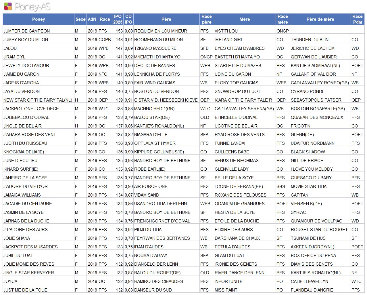 Classement des poneys de 5 ans