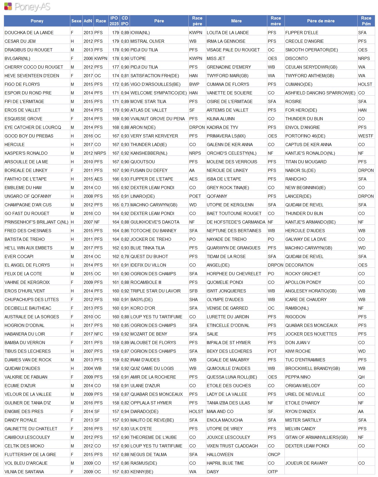 Sans surprise, eu égard à ses performances cette saison, Douchka de la Lande (Pfs, par Iowa, Kwpn et Lolita de la Lande par Flipper d’Elle, Sf) obtient un excellent indice et même le meilleur : 179 (0,89).