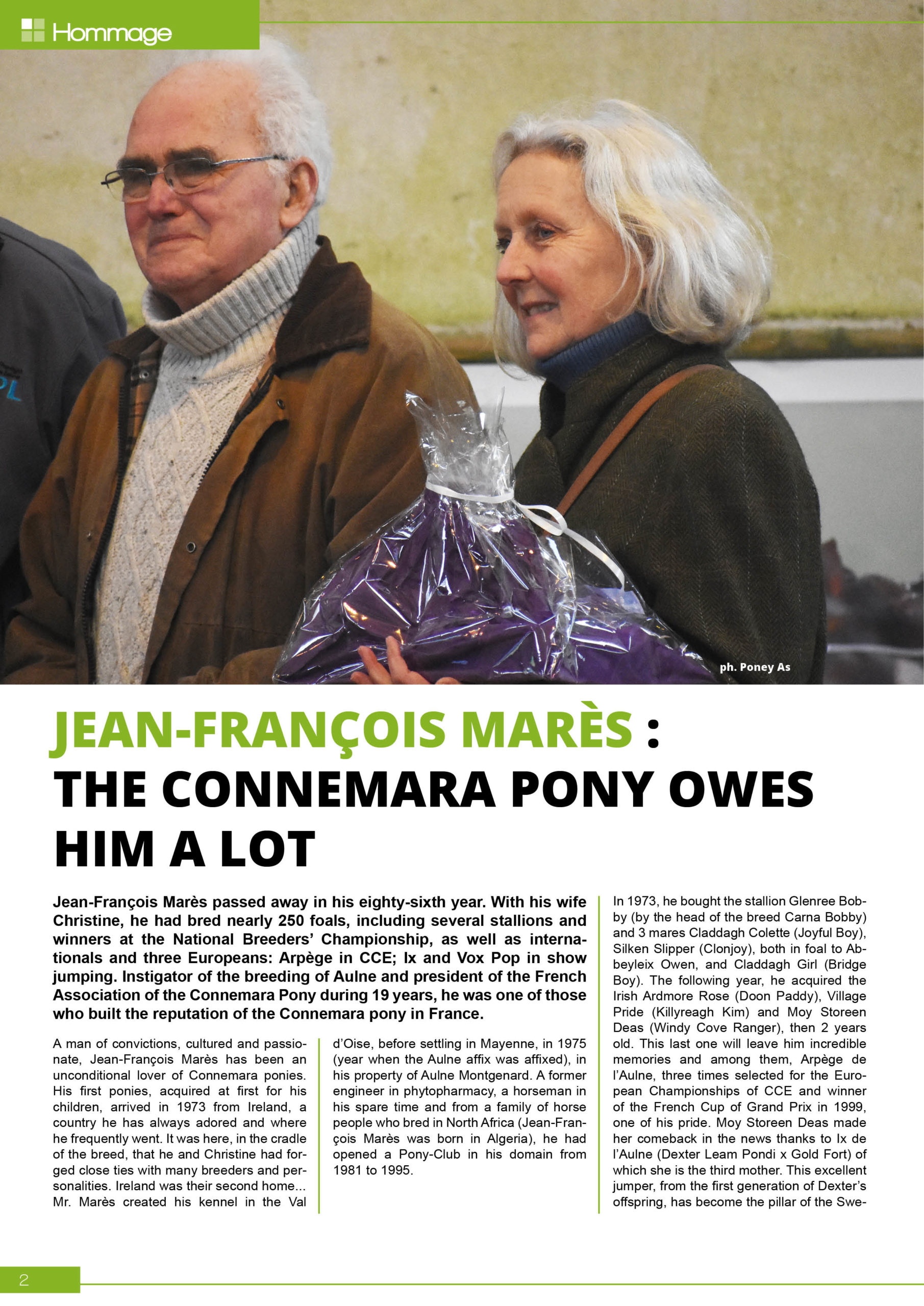 Jean-François Marès passed away in his eighty-sixth year. With his wife Christine, he had bred nearly 250 foals, including several stallions and winners at the National Breeders’ Championship, as well as interna- tionals and three Europeans: Arpège in CCE; Ix and Vox Pop in show jumping. Instigator of the breeding of Aulne and president of the French Association of the Connemara Pony during 19 years, he was one of those who built the reputation of the Connemara pony in France.