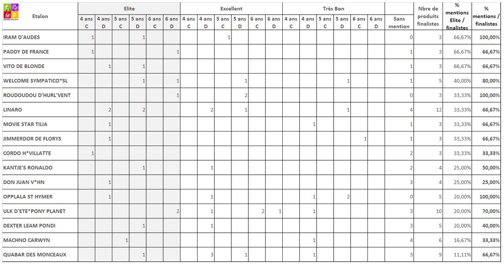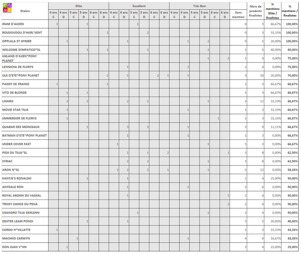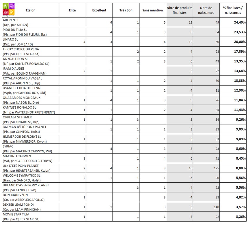 Là encore, 4 étalons ne figurent pas dans ce tableau de données n’ayant chacun que 2 produits finalistes, mais leur ratio de 100% est toutefois à retenir. Il s’agit de la star Allemande Cornet Obolensky (par Clinton), du Connemara Poetic Justice SL (par Ballydonagh Cassanova), du Pfs champion de France As Poney 1 de CSO Udaipur Nordmann (par Mad du Bosc) et du petit Pfs de taille C classé jusqu’en Grand Prix de CSO, Quest du Buhot (par Nabor SL, Drp).