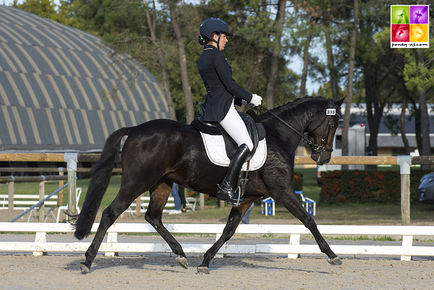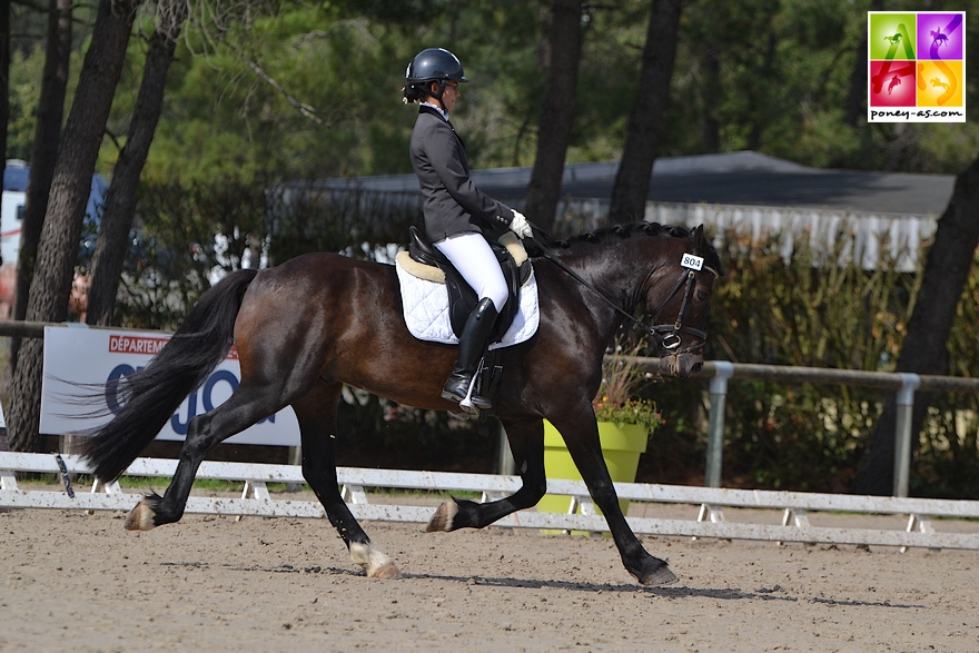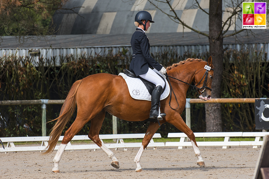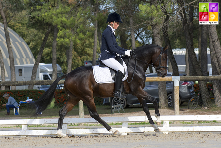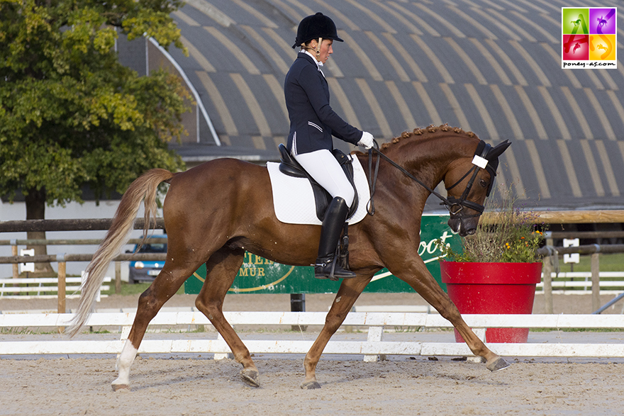 Julia Leborgne a elle remporté la finale des 5 et des 6 ans avec deux mâles acquis jeunes auprès du Syndicat Linaro. Tout d’abord avec le 5 ans Chtromae Linaro (par Strahlemann, Old et FS Magic Light SL, Drp par FS Golden Highlight, Drp), Pfs mais doté d’un pedigree Allemand, vainqueur haut la main de la Préliminaire avec 83%, mais seulement 4e le dimanche avec 72,6%, les juges le pénalisant sur le pas. Outre ses notes (77,8% score global), ce joli mâle bai foncé bien dessiné, qui a véritablement commencé la compétition en juillet avec 4 premières primes sur 4 (blessé l’an passé), a présenté le meilleur potentiel de sa classe d’âge. Sa souche est elle aussi alléchante : sa mère, FS Magic Light SL, acquise en Allemagne par le Syndicat Linaro, a entre autres produits le champion d’Europe par équipes en Dressage Drink Pink, également 7e de l’Individuelle et 5e de la Kür à Kaposvàr, elle a depuis été vendue à l’Elevage de Pondole (Véronique Brasiles, mention Excellent avec tous ses poneys ce week-end), en co-propriété avec l’Elevage Uprising. Le Oldenburg Strahlemann (Sandro Hit x Weltmeyer) pour sa part, a pour particularité de ne toiser qu’1,55 m et a donc été bien utilisé en croisements poneys Outre-Rhin.
