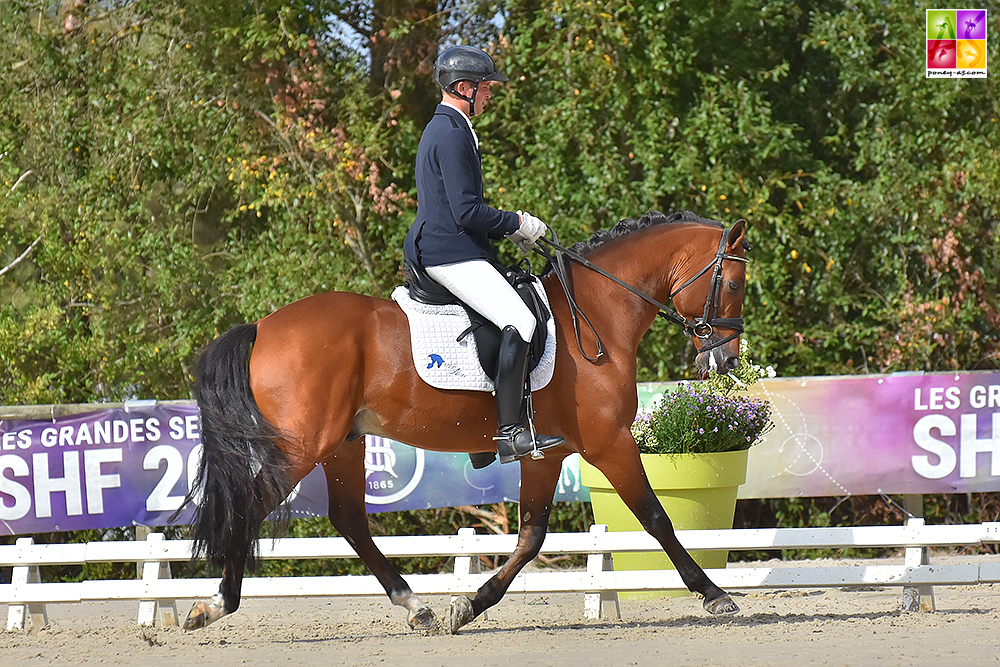 L’étalon Poney Français de Selle Envoyé Spécial du Luy s’est vu remettre le titre sous la selle de Julien Vincent avec qui il a obtenu 79% le premier jour, soit une belle avance sur ses adversaires, puis 73,30% (76,15% au général). Plus éteint samedi, il a déroulé des reprises propres et sans fautes majeures, bien mis en valeur par son cavalier professionnel. Ce poney équilibré, finaliste en CSO à 4 ans (classé Très Bon), appartenant à Olivia Renard qui le montait l’an passé (4e, Excellent), est né chez Bérangère Mouroux. Il s’agit d’un fils de Quoutsou et de Sitgess du Luy (par Thunder du Blin, Co), soit un frère utérin de l’étalon Cas d’Ecole du Luy.