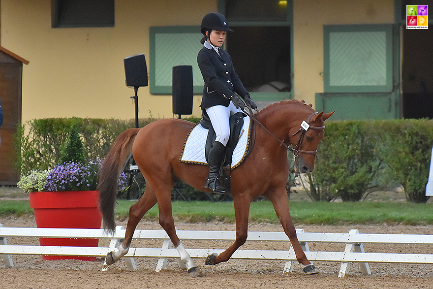 Le troisième et dernier champion se nomme Dazzling Kid d’Herbord. Le hongre, né chez Anne-marie Chanfreau dans la Vienne (86) et appartenant à Delphine Colmant, s’impose dans la finale des 6 ans et reçoit les scores suivants sous la selle de sa cavalière Margaux Mader, élève de Marine Colmant : 80,40% et 75,8% (78,10%). Le champion des 6 ans est inscrit au stud-book de l’Aes et est un fils d’Oscar la Chevalerie et de la Welsh Part-Bred Ma Rousse d’Herbord (par Flatteur, Wtc). Très bien noté sur la première reprise (davantage sollicité par sa cavalière dimanche), les juges ont souligné son activité constante au trot (8,5), sa bonne cadence et son amplitude, ses transitions, ainsi qu’une bonne élévation au galop (8) et une soumission notée à 8,50. Pas assez rond et pénalisé d’un manque de régularité, le pas est son allure la moins bien notée. Margaux Mader le monte depuis son plus jeune âge et a pratiqué avec lui les trois disciplines olympiques. Il est désormais associé à Blanche Carre Pistollet avec qui il débute en As Poney 1.