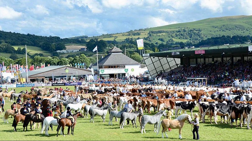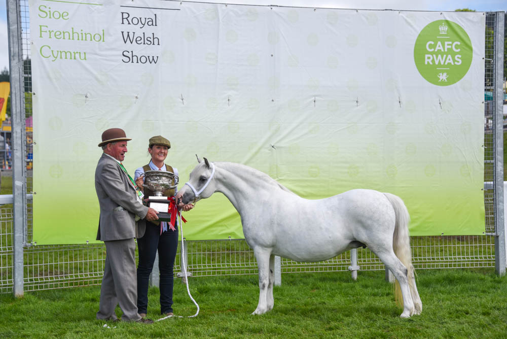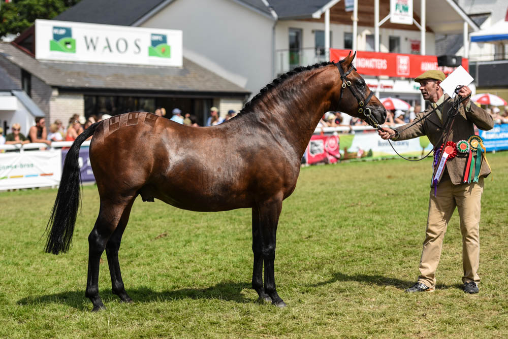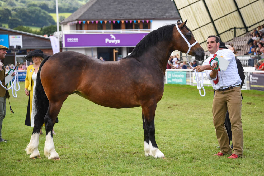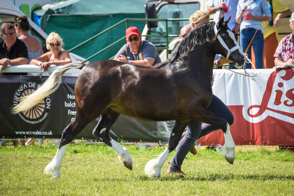 Le Royal Welsh Show, ou Sioe Frenhinol Cymru en Gallois, prend ainsi place chaque années à Builth Wells, petite bourgade galloise située sur les bords du Wye, dans le comté de Powys, au Nord de Cardiff dont elle est à une heure et demi de voiture. Le RWS, c’est la plus grande foire agricole extérieure d’Europe, avec ses 250 000 spectateurs sur quatre jours à 25 livres sterling l’entrée, 22 000 véhicules garés chaque jour, 8 000 chevaux et poneys, 90 hectares (sans les parkings qui doublent la surface), 9 carrières en plus de la carrière principale entourée de superbes montagnes galloises, 1200 stands d’équipements agricoles, d’animaux, de nourriture, de matériel de toute sortes, et ses concours de moutons, de bovins, de caprins, de cochons, de poules, du meilleur miel, de la meringue la plus réussie etc, sans oublier de très diverses animations et spectacles en tous genres. Pour le clou du spectacle le dernier jour, le show des étalons Welsh Cobs et le championnat suprême Welsh, les tribunes sont pleines de 4000 fanatiques… et on en compte sûrement autant autours du ring.