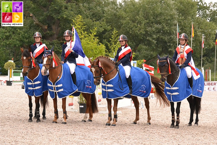 2011 – L’équipe de France composée de Fanny Barrière (Plume de Virey), Thaïs Meheust (Java Bleue La Brée), Léa Teissier (Nitzpogne) et Luce (Mon Nantano) est championne d’Europe par équipe – ph. Poney As