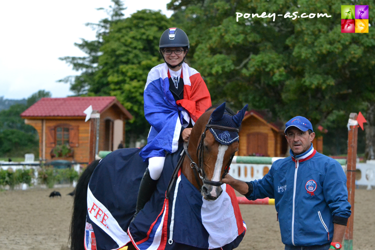 La suprématie française est patente et à ce stade de la compétition, notre troisième cavalier peut d’ores et déjà mettre fin au suspens… du moins pour l’octroi de la médaille au précieux métal ! Calculette en main, c’est rapide… Ninon et Quabar, sans faute, propulsent l’équipe tricolore sur la plus haute marche. Sans aucune émotion, le couple champion de France déroule son parcours. Pas de heurt, c’est limpide. C’est une petite promenade de santé !! Le clan français exulte. Ligne d’arrivée franchie. Le tableau affiche un petit point de temps dépassé. La France est sacrée championne d’Europe, et ce, en s’offrant le luxe de ne pas comptabiliser le score de sa quatrième cartouche. Fantastique… Emouvant … Quel sang froid de la part de nos pilotes !