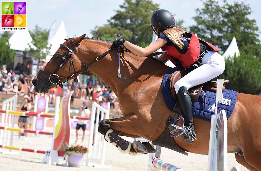CS : Oui, c’est vraiment un poney à l’écoute, il avait envie de bien faire ! Sur le championnat As Poney 2, nous faisons un quadruple sans-faute. Il n’a pas forcé, c’était plutôt facile pour lui ! Lors de la finale, il s’est montré très joueur, le barrage lui a plu ! Pour la finale des 7 ans, c’était la première fois que nous sautions aussi gros (1,25 m), j’avais juste fais avant une 1,20 m qui s’était très bien passée. Il était top. Le premier jour, il n’était pas hésitant, mais un petit peu derrière moi et nous faisons une barre. Le second jour, il fait un superbe sans-faute. Dans la finale, il met un pied dans la rivière un peu de ma faute, d’où mes 4 points. Il était magique !