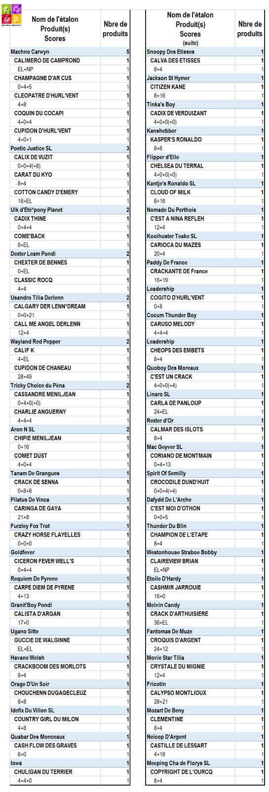 Parmi les pères de mère, 3 étalons avaient au moins 2 produits : 3 pour Durello SL, 2 pour Dexter Leam Pondi et Linaro SL.