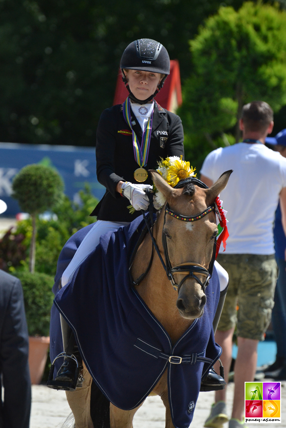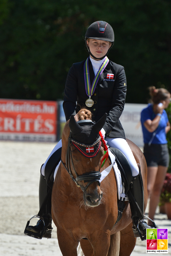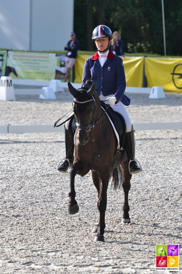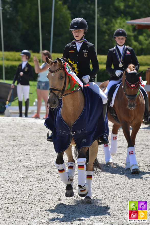 Déjà championne d’Europe par équipes, puis en individuel la veille, Lucie-Anouk Baumgürtel, 13 ans, associée à son partenaire Zinq Massimiliano FH, a remporté son troisième titre… Malgré une petite irrégularité dans le premier trot, inévitablement effacée par une technique imparable et une bonne prise de risques – dont un trot moyen à une main en guise de sortie – le couple a véritablement séduit les juges, ces derniers lui attribuant 81,55% ! Deux points de plus donc que la Danoise Louise Christensen et son génial étalon Néerlandais toujours très fixe Vegelins Goya (79,60%), auteurs d’une reprise parfaite qui aurait pu valoir l’or ; et quatre points de plus que l’autre couple Danois, Sara Aagaard Hyrm et son étalon palomino doré, toujours aussi flegmatique, Der Harlekin B (77,40%).
