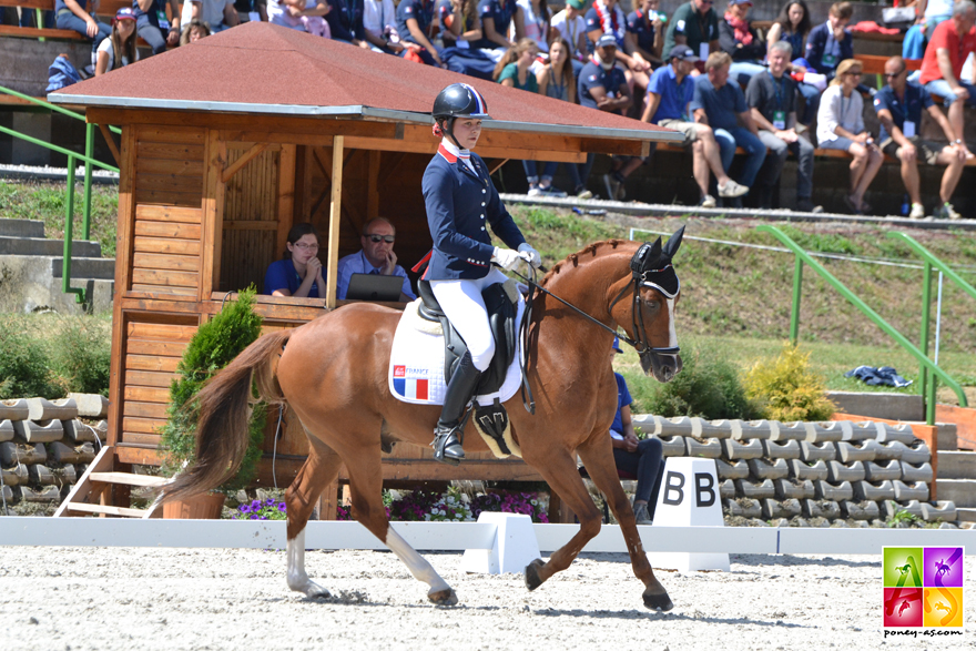 Si les objectifs de la première journée étaient atteints, sur la seconde, la consigne était d’augmenter le rythme, passer à la vitesse supérieure pour arracher deux 69% voir un 70%. Le classement reposait sur Aurore Thévenot associée à son fidèle Osbourne et Charlotte Palas en selle sur Under Cover Fast. Faisable, mais ce ne fut pas le cas. En effet, nos deux piliers ont commis des petites fautes sans doute à mettre sur le compte de la pression, comme l’analysait le soir même la chef d’équipe, Muriel Léonardi. Aurore et Osbourne sont sortis de piste avec un score de 67,667%. Davantage habitués au 68/69%, ils ont perdu des points pour une demi pirouette collée, des appuyers à gauche compliqués et une grosse imprécision sur la demi-volte bouclée à la lettre d’après (en E au lieu du S), tout en assurant des 7 au galop. Charlotte et Under Cover se sont heurtés à un premier départ involontaire au galop dans le travail au trot, suivi d’un second. Pas assez serein, le verdict fut sans appel pour nos champions de France : 64,897%. Les Bleuets se plaçaient à la 7e place mercredi soir, un rang qui s’avérera définitif le lendemain (les médailles devaient en effet être attribuées mercredi, mais le gros orage qui s’est abattu sur la ville a forcé les organisateurs à interrompre l’épreuve alors qu’il restait encore 5 couples à passer. Dernière cavalière, la triple médaillée d’or de l’an passé Lucie-Anouk Baumgürtel a même essuyé 3 petits écarts de Zinq Massimiliano FH). L’Allemagne tenait la tête, mais le Danemark pouvait encore aller chercher le titre ! Quant à la Grande-Bretagne, elle était assurée de monter sur la troisième marche du podium. Mais qu’il est difficile d’aller chercher la Mannschaft… Le podium resta au final tel quel…
