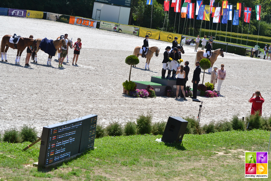 Dans ce dernier groupe auquel ont participé plusieurs « extraterrestres » de la discipline – tels que la géniale Movie Star du Néerlandais Marten Luiten (75,475%, 7e), la ballerine Madam’s Miss Maria associée à la Britannique Sophie Taylor (72,625%, 11e) et le multi médaillé SL Lucci de la Britannique Anya Kolleth (73,725, 9e) – on attendait peut-être un top score de Jana Lang et son petit NK Cyrill. Malgré une belle prise de risques sur une musique entrainante – trot moyen dans la première partie de diagonale, puis appuyers – l’autre couple allemand n’a pas réussi à devancer sa camarade Lucie-Anouk Baumgürtel… pas plus que les deux danoises… Jana et sa petite balle palomino se sont retrouvés au pied du podium. C’est dire le niveau de la compétition !