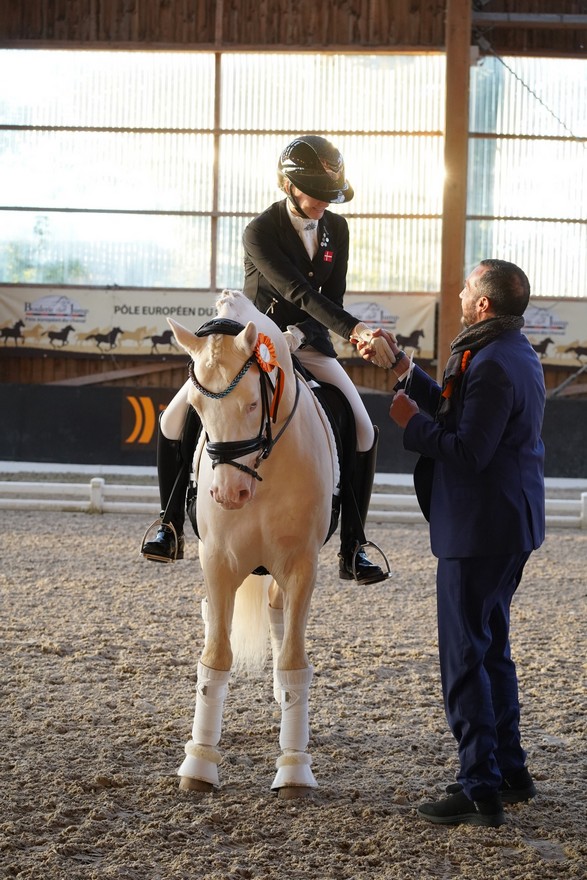 Le poney de selle danois de 6 ans Mr. Frosty Blue JR, aux origines allemandes – fils de FS Mr.Right et de Champiolina, elle-même fille du chef de race FS Champion de Luxe – a remporté les deux premières reprises du CDIP. Perméable aux aides de sa cavalière de 16 ans Maja Storgaard Buch, qui le monte depuis un an et disputait elle aussi sa première compétition internationale, l’étalon cremello a séduit le jury par ses prestations harmonieuses et a été crédité de jolis scores : 71,238 % dans l’Équipe et 70,27 % dans l’Individuelle. Dans la Kür, malgré quelques fautes, il a une nouvelle fois dépassé la barre des 70 %, terminant cette fois au pied du podium.