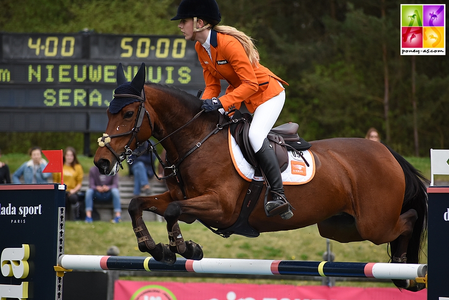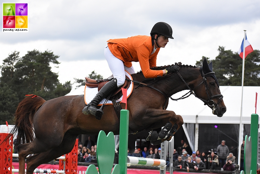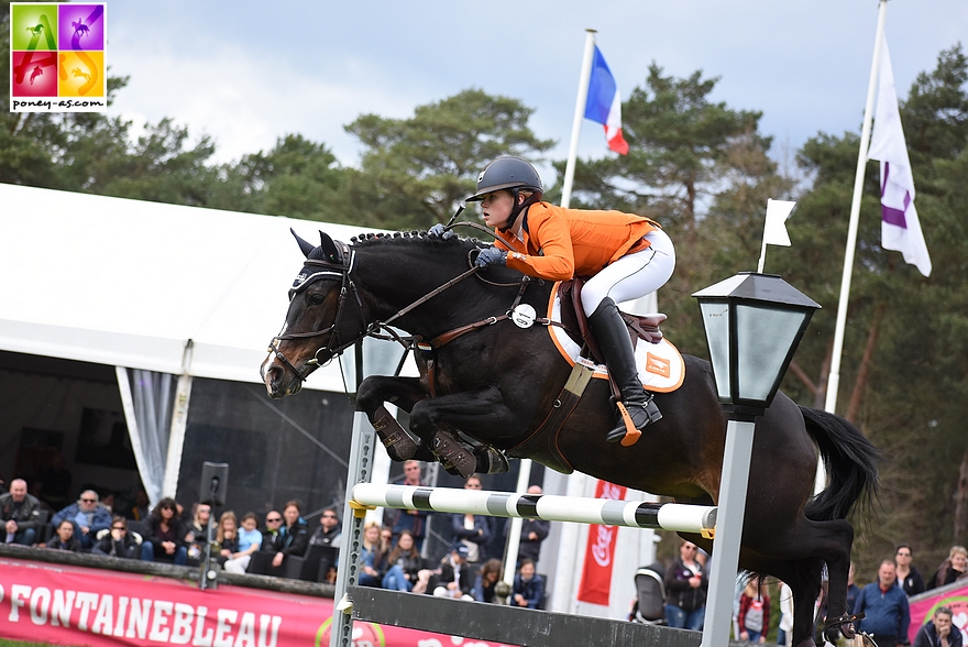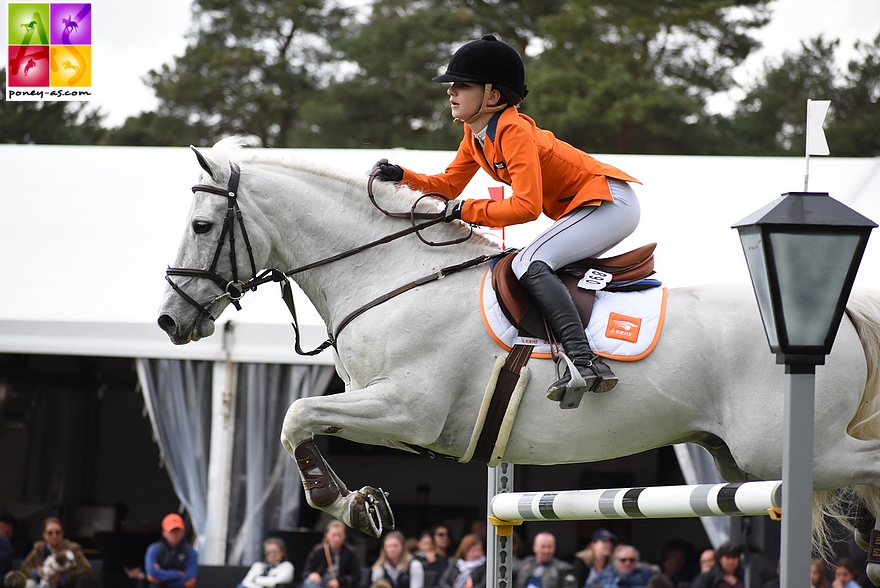La première à s’élancer a été Liv Huijbregts avec le hongre gris de 8 ans Enzovoort Dew-Drop (par Anthem Dew Drop), issu de la souche Connemara de l’élevage Aluinn de Sophie Bolze via sa mère Monaghan Aluinn. 4 points vendredi et sans-faute samedi sur le tour de la Coupe des nations mais partie en individuelle, la Néerlandaise s’est pourtant retrouvée en grande difficulté sur ce Grand Prix. Deux de ses camarades, les très bons pilotes Pam Nieuwenhuis (cavalière européenne de l’étalon Zeppe van de Ijsseldijk SL) qui présentait là l’excellente Seraja (par Kantje’s Ronaldo SL) et le non moins talentueux Mart Ijland avec sa géniale mais capricieuse Fantasia (par For Kids Only) seront tout bonnement… éliminés ! Mart n’arrivera pas à passer le premier, son alezane reculant et se rebiffant pendant une bonne minute ! Pour Fleur Holleman et Dante (Twinkling Starr Aristo), le compteur s’élèvera à 9 points pour deux barres et du temps. Beaucoup moins de réussite donc pour les vestes oranges que la veille !