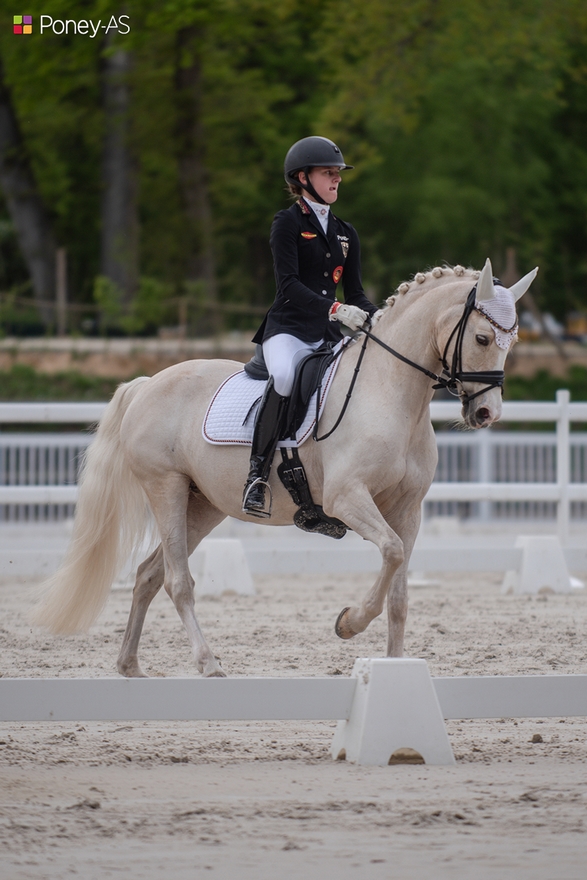 Pourtant, la jeune fille, âgée de 13 ans à l’époque, n’envisage pas immédiatement les plus gros concours internationaux. Au départ, l’idée était de faire des petits concours, mais il y a eu beaucoup de travail, jusqu’à ce que le couple atteigne le circuit FEI poney… et avec succès ! Après de nombreux podiums en concours internationaux, c’est logiquement que le couple est de la partie aux championnats d’Europe de Strzegom à l’été 2022. Et la consécration arrive : le couple est champion d’Europe sur la reprise individuelle. Bien sûr, au vu de cette trajectoire, la jeune fille est très fière de tout le chemin parcouru et des progrès réalisés avec son partenaire.