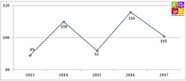 Évolution du nombre de poneys finalistes de 2013 à 2017 – SHF CSO 6 ans D