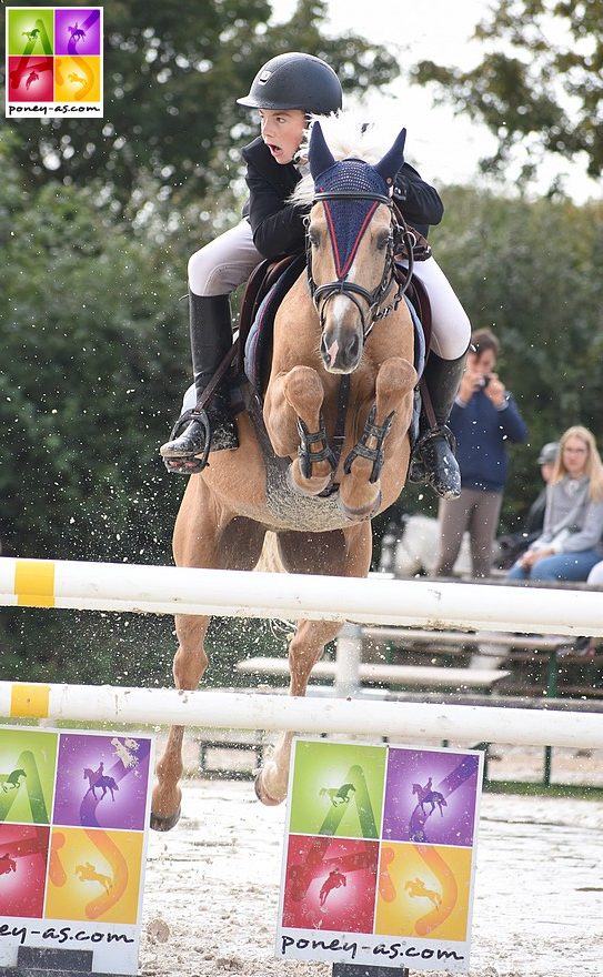 Le Grand Prix As Poney Elite s’est ensuite disputé entre 3 couples. Elise Charkos, l’ouvreuse, a été pénalisée de 8 points aux rênes de sa fidèle Uncia du Theillet (Co, par Fricotin et Deidre de l’Aubier par Fakir de Ravary), soit le même score que Raphael Wiethe, qui avait sellé ce week-end son bondissant petit palomino Orchid’s Brad (Nrps, par Orchid’s Cestanii et Orchid’s Brenda par Watershof Pretendent SL, Nf). Ces deux tandems se sont ensuite départagés au barrage puisque la dernière à s’élancer, Lou Morali en selle sur Caruso Melody, qui effectuait ici son premier Grand Prix après la finale des 7 ans du mois d’août, pointait à 12 points.